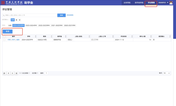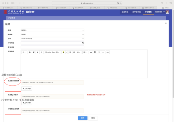 2、各教学单位登录OA中的智慧学工系统进行审核,完成所有审核后在系统上选择【汇总表打印】纸质盖章,在系统【评议管理】点击新建并上传盖章的汇总表。具体操作如下图所示,于1月6日16:00前将完成。